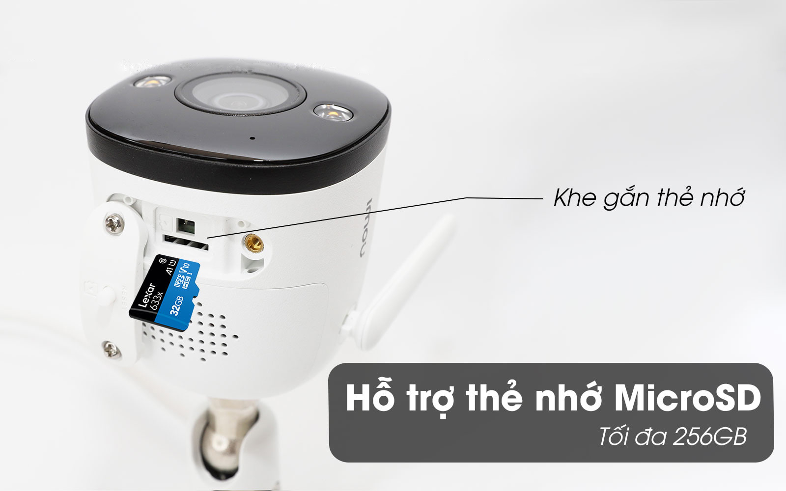 Trên bề mặt camera trang bị khe cắm thẻ nhớ tiện lợi với dung lượng lớn lên đến 256GB. Bạn có thể mua thẻ nhớ, phù hợp với nhu cầu sử dụng: