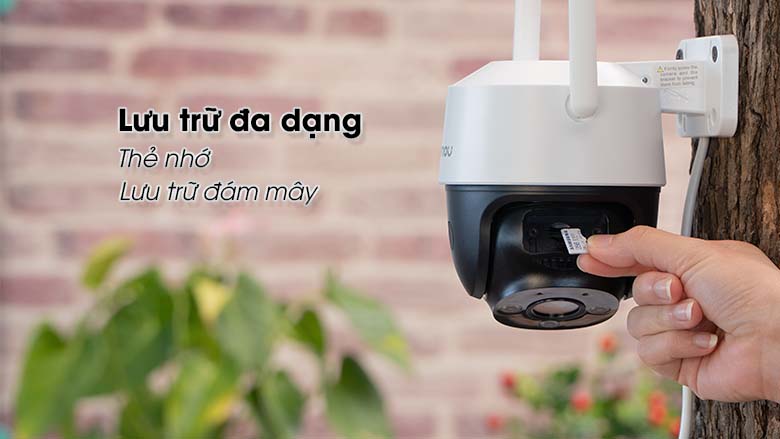 Trên thân camera có sẵn khe cắm thẻ nhớ Micro SD (tối đa 256GB) hoặc nếu muốn lưu trữ lâu hơn có thể lựa chọn Cloud hoặc đầu ghi NVR.